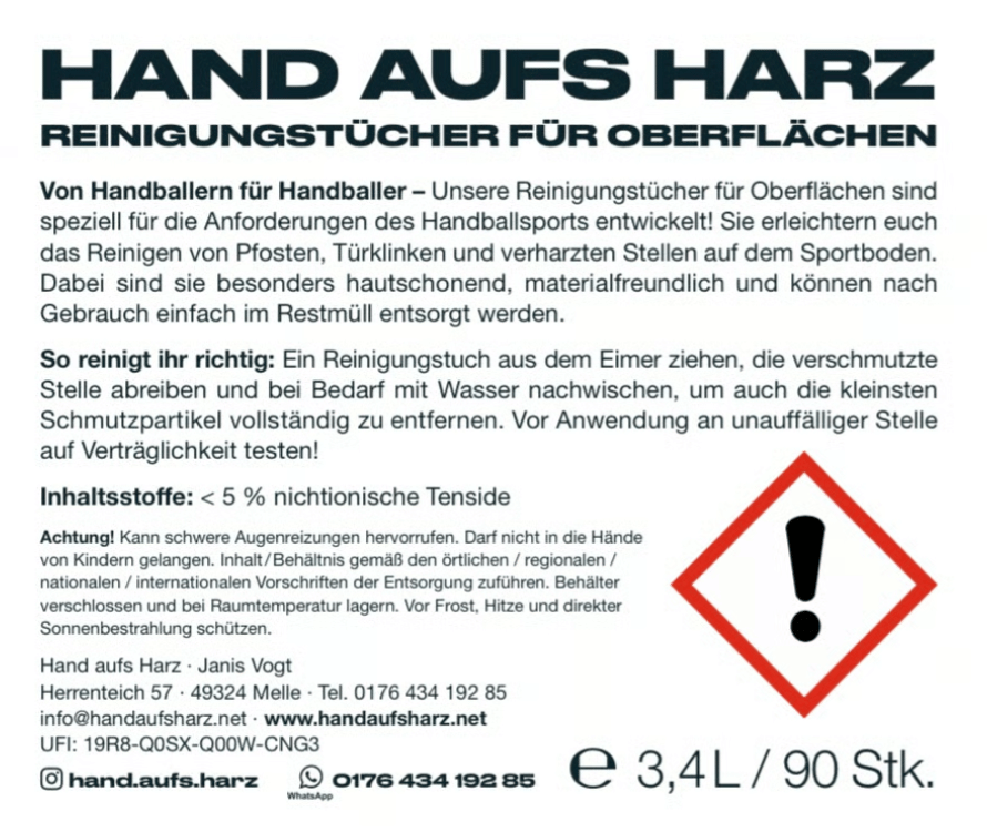 Unsere Hand aufs Harz Reinigungstücher für Oberflächen sind speziell für den Handballsport entwickelt. Sie erleichtern dir das Entfernen von Harzresten an Pfosten, Türklinken oder Sportböden – gründlich, materialfreundlich und jederzeit einsatzbereit.
